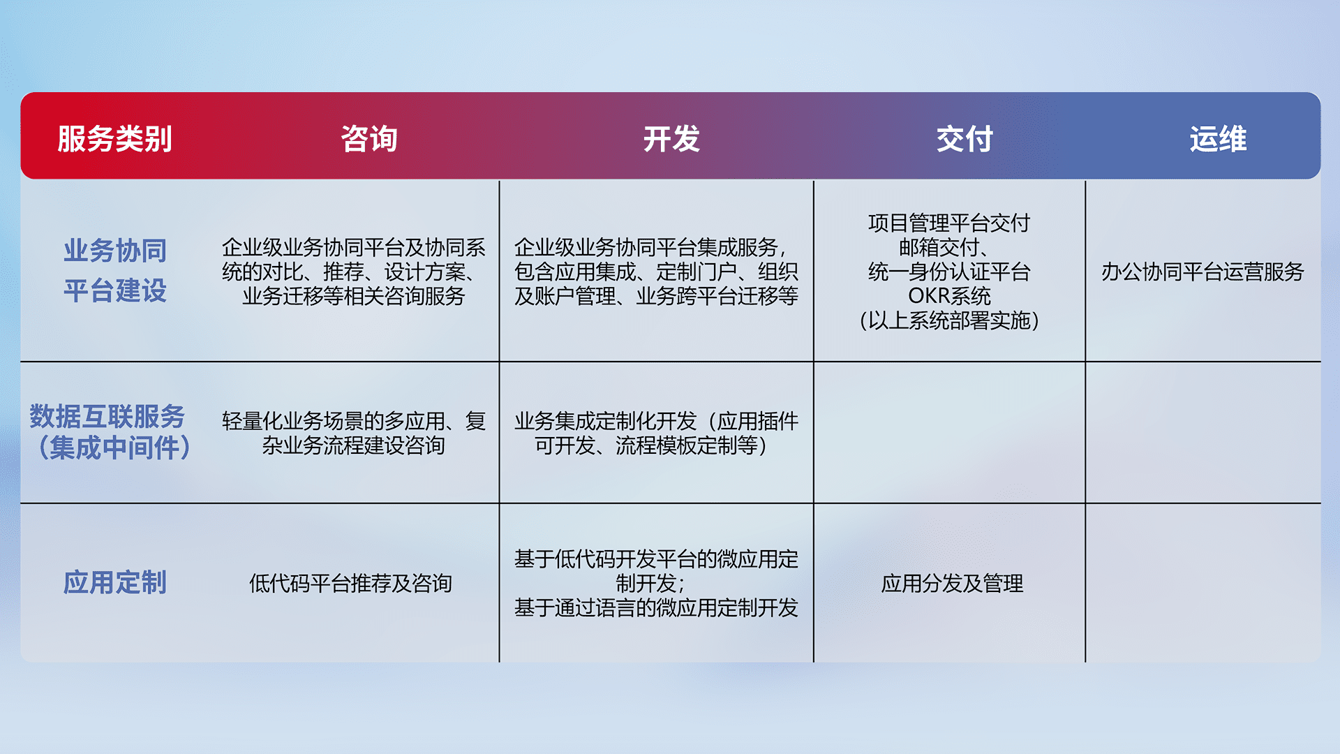 针对钉钉、、、、企微、、IDaas等平台级产品提供产品的规划、、方案、、、交付、、定制化开发等服务,,,,实现如统一协同办公、、智能客户服务、、混合会议管理、、、、智能数据查询、、等业务场景,,实现数字化转型。。